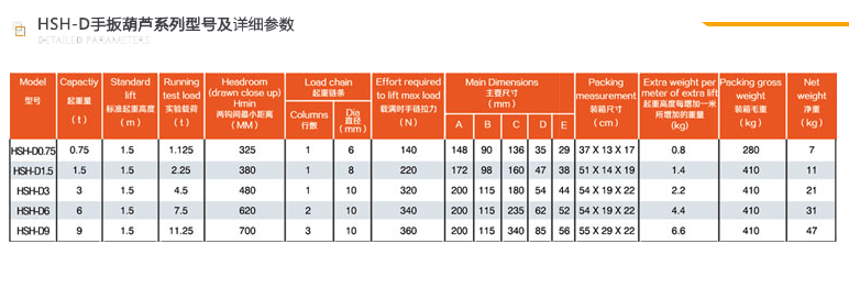 双鸽牌HSH-D型手扳葫芦是我公司研制开发的新一代手扳葫芦。其设计采用欧美标准,它吸取了国内外手扳葫芦的优点,设计有快速自锁装置,无需打开离合器,便可轻快调整两钧间距离,便于单手操作。当受载超过17KG时,具有快速制动功能;链轮采用锻坯,仿形精铣链槽,具有功能齐全、强度高、传动可靠等优点。